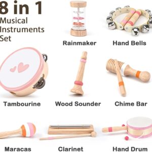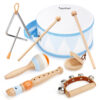 - 8-Piece Musical Set: Includes maracas, tambourine, flute, wooden sounder, hand drum, rainmaker, chime bar & hand bells for solo or group play.