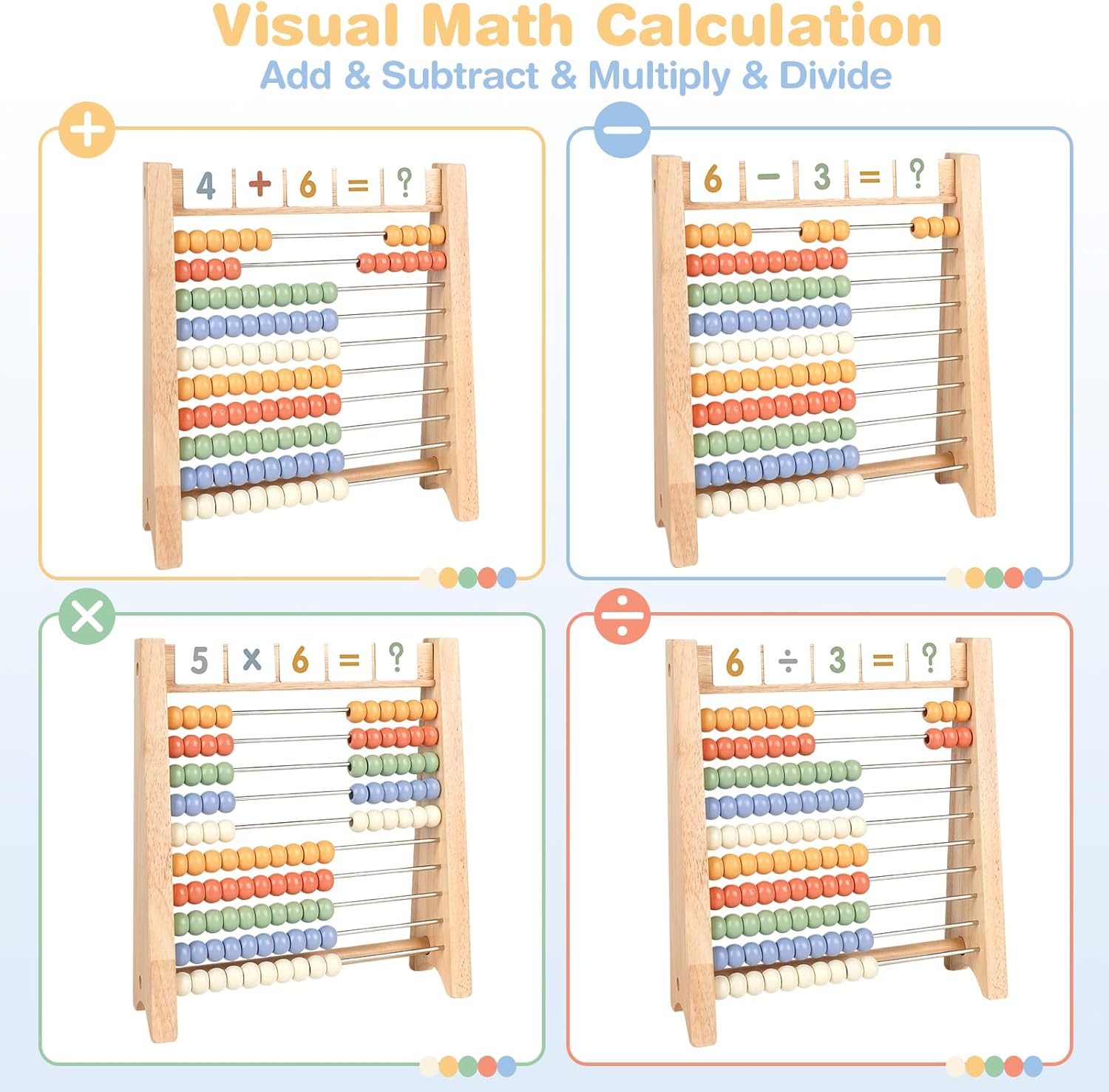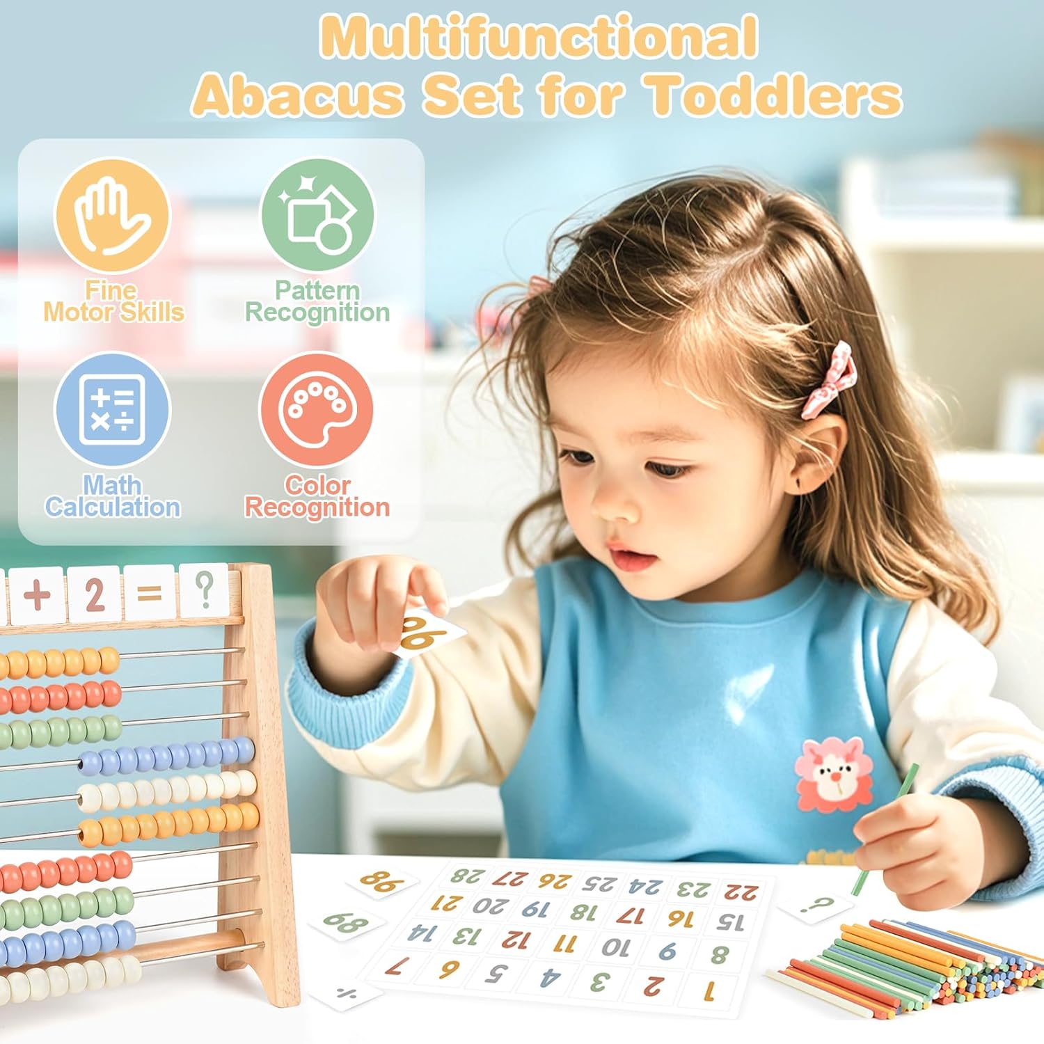- Hands-On Learning: Slide beads, use counting sticks, or math cards to explore numbers, patterns, and basic calculations.